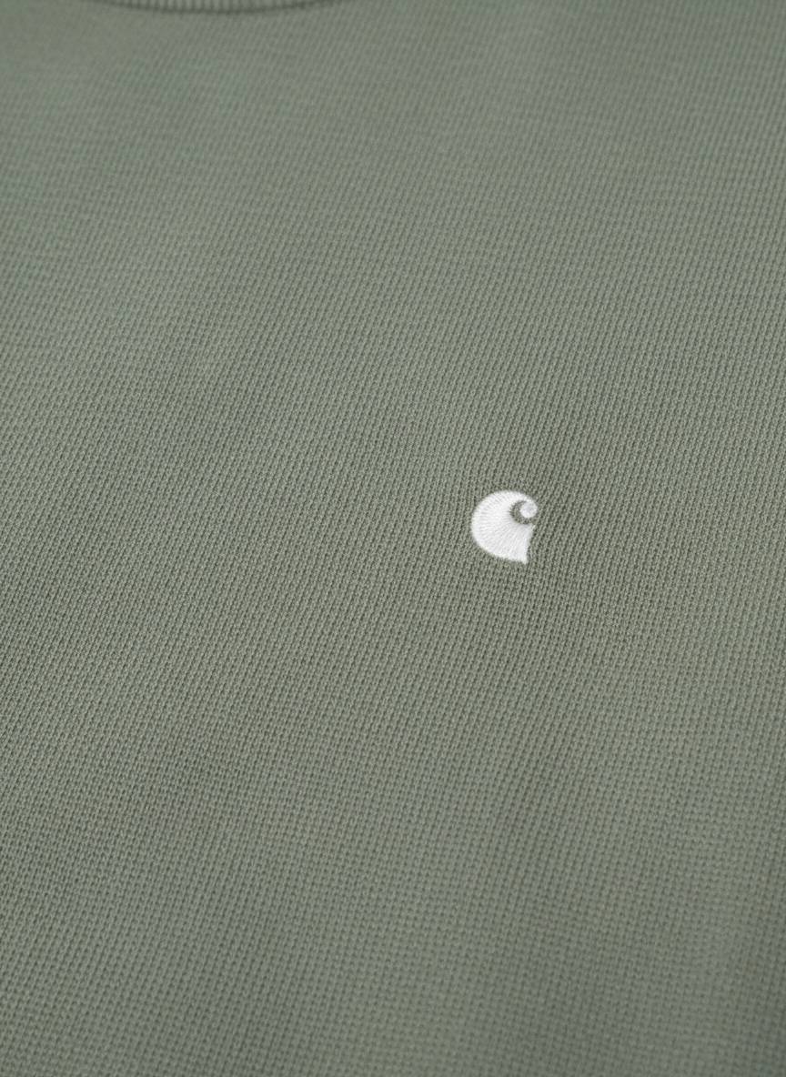 La combinazione di colori Velvet Green/White conferisce un look fresco e urbano, mentre il logo Carhartt WIP ricamato sul petto aggiunge un dettaglio distintivo e riconoscibile. Il taglio regolare e i bordi a costine su collo, polsi e orlo assicurano una vestibilità comoda e una struttura ottimale al capo.
