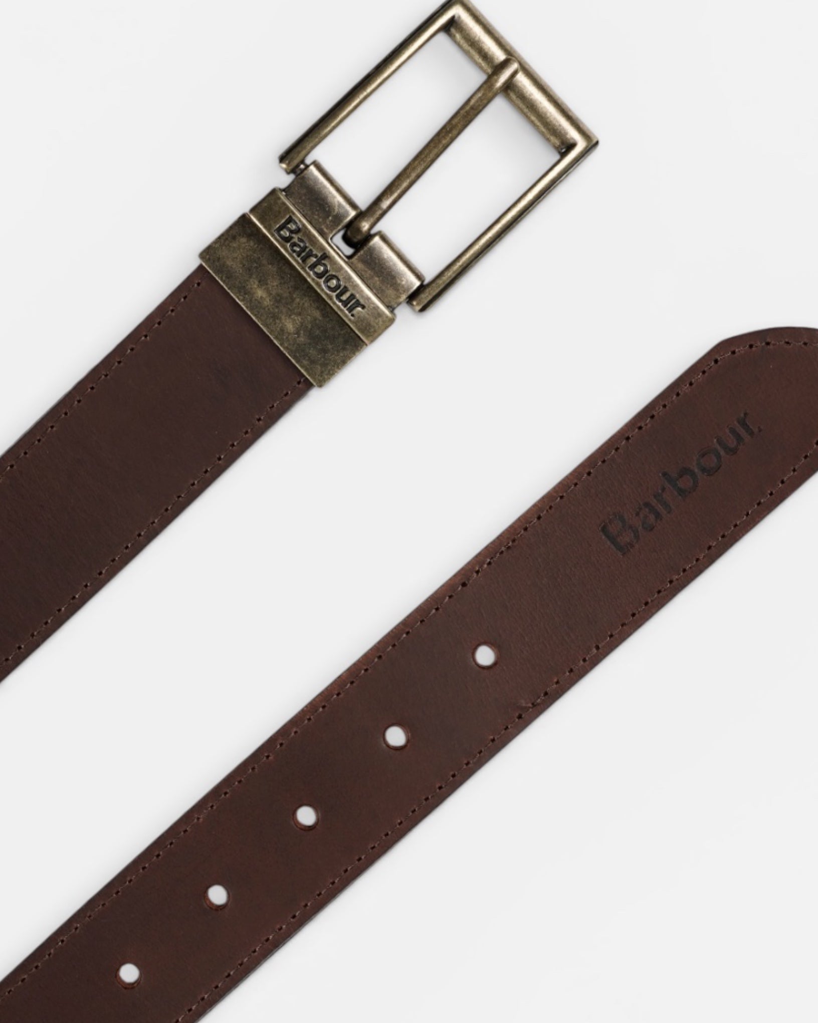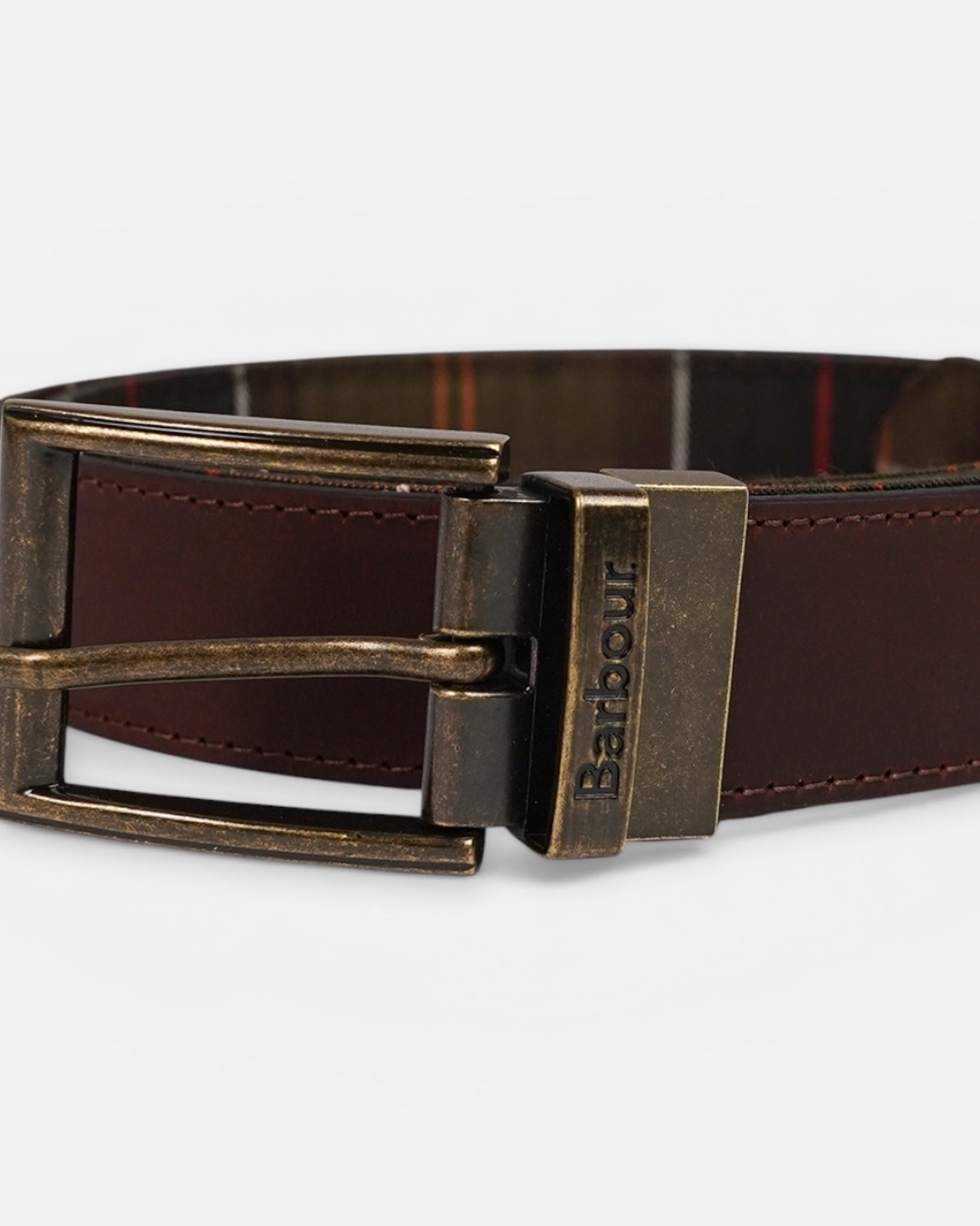 La cintura versatile offre due stili in un'unica soluzione, presentando un lato in pelle e l'altro in twill Classic Tartan di Barbour. La fibbia a sgancio rapido è ornata con un logo inciso, mentre il logo in rilievo appare sulla punta della cintura.