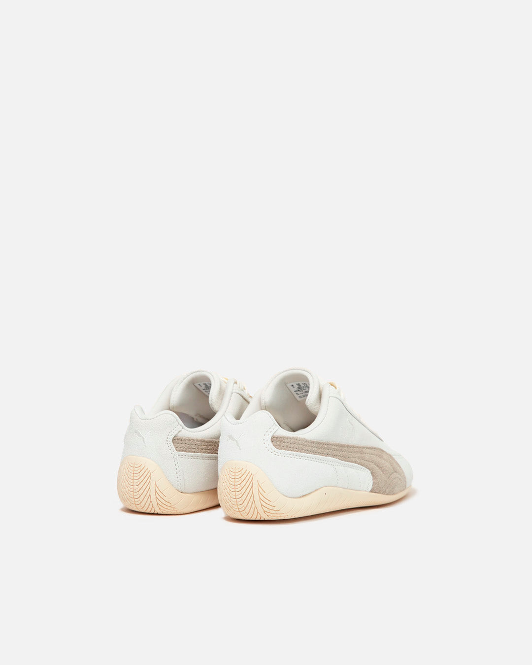 La tomaia in morbida pelle scamosciata, nella tonalità Warm White–Ice Coffee, offre un’eleganza sobria e versatile, mentre la silhouette affusolata e la suola sottile assicurano un profilo femminile e sportivo. Il logo Puma Formstrip laterale e il lettering dorato Speedcat richiamano l’eredità racing del marchio, aggiungendo un tocco distintivo.